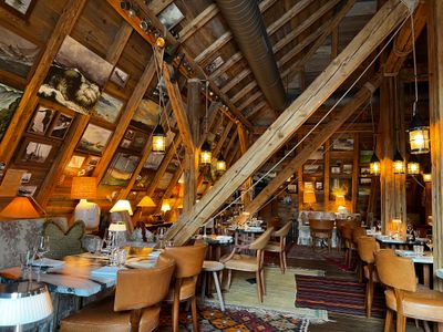 Das Restaurant belegt einen ehemaligen Dachboden unter der historischen Kuppel des Hotels und zeigt ursprüngliche architektonische Elemente mit freiliegenden Ziegelwänden und Holzböden, die traditionelle Schweizer Baukunst aus früheren Epochen widerspiegeln.