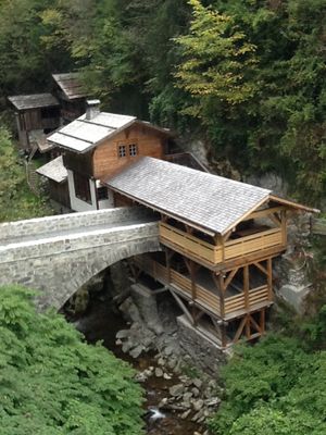 Die Mühlengebäude stehen an den steilen Hängen der Tine-Schlucht und nutzen Wasserkraft für ihre Betriebe.