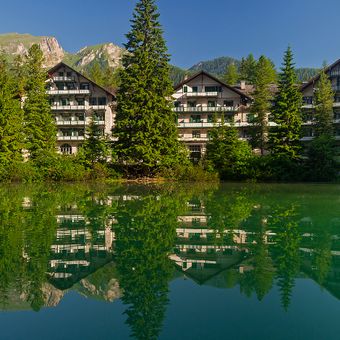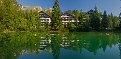 Das Hotel Pragser Wildsee steht direkt am Ufer des Sees, mit Zimmern die einen Ausblick auf die Dolomiten bieten.