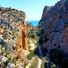 Der Pfad führt durch eine Schlucht mit vertikalen Felswänden zu einem abgelegenen Strand mit kristallklarem Wasser und Kieseln.