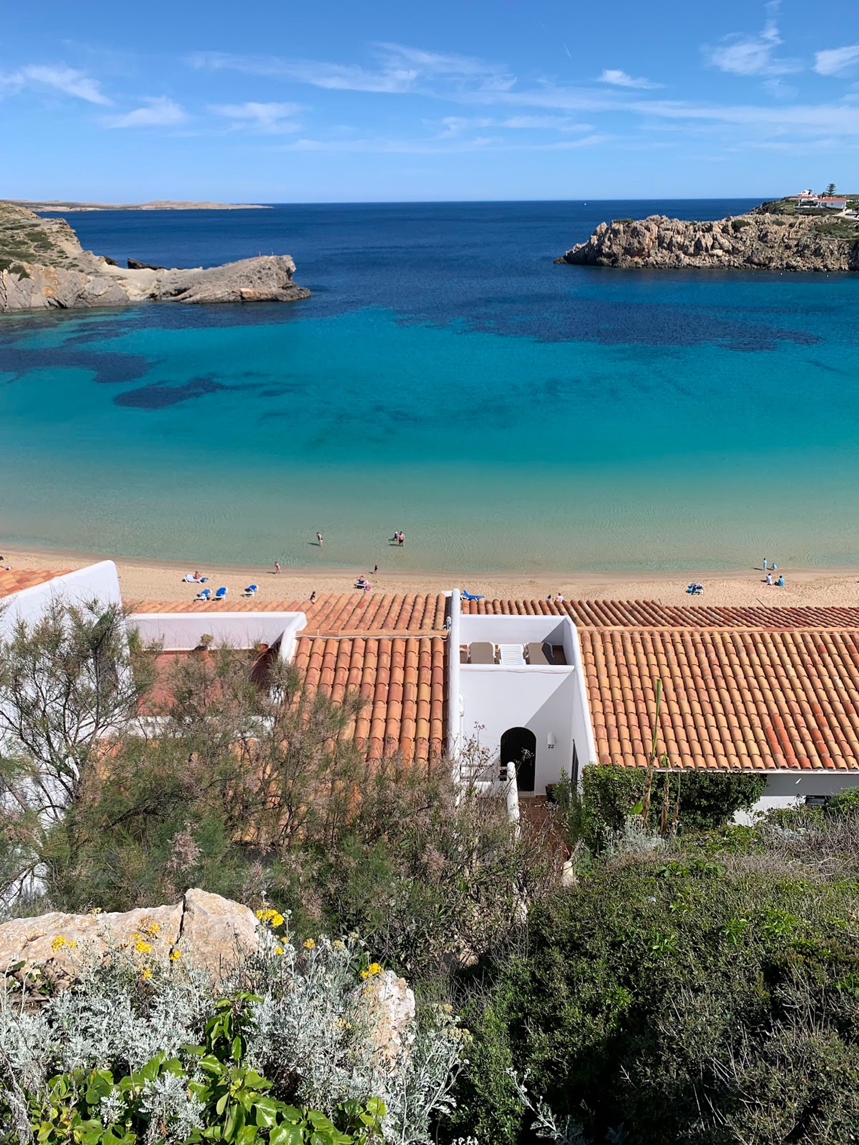 Der Strand erstreckt sich über 654 Meter entlang der nördlichen Küste Menorcas, mit weißem Sand und geschützten Gewässern in einer natürlichen Bucht.