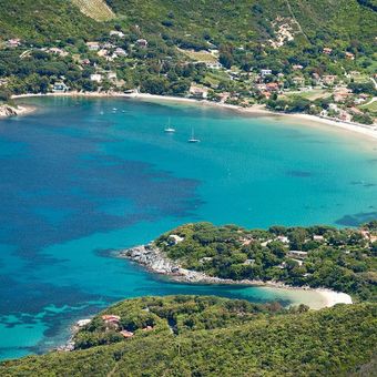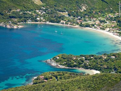 Die Strandlage bietet direkte Aussicht auf die Gipfel des Monte Perone und Monte Capanne, mit Wassersportschulen für Segel- und Surfunterricht.