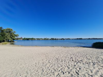 Der feinsandige Strand erstreckt sich entlang der Südseite des Banter Sees und bietet Platz zum Schwimmen und Sonnenbaden.