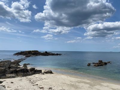 Die Küstenlinie erstreckt sich entlang des Atlantiks mit feinem Sand, der von Felsen gesäumt wird und klarem Wasser für Sommeraktivitäten.