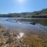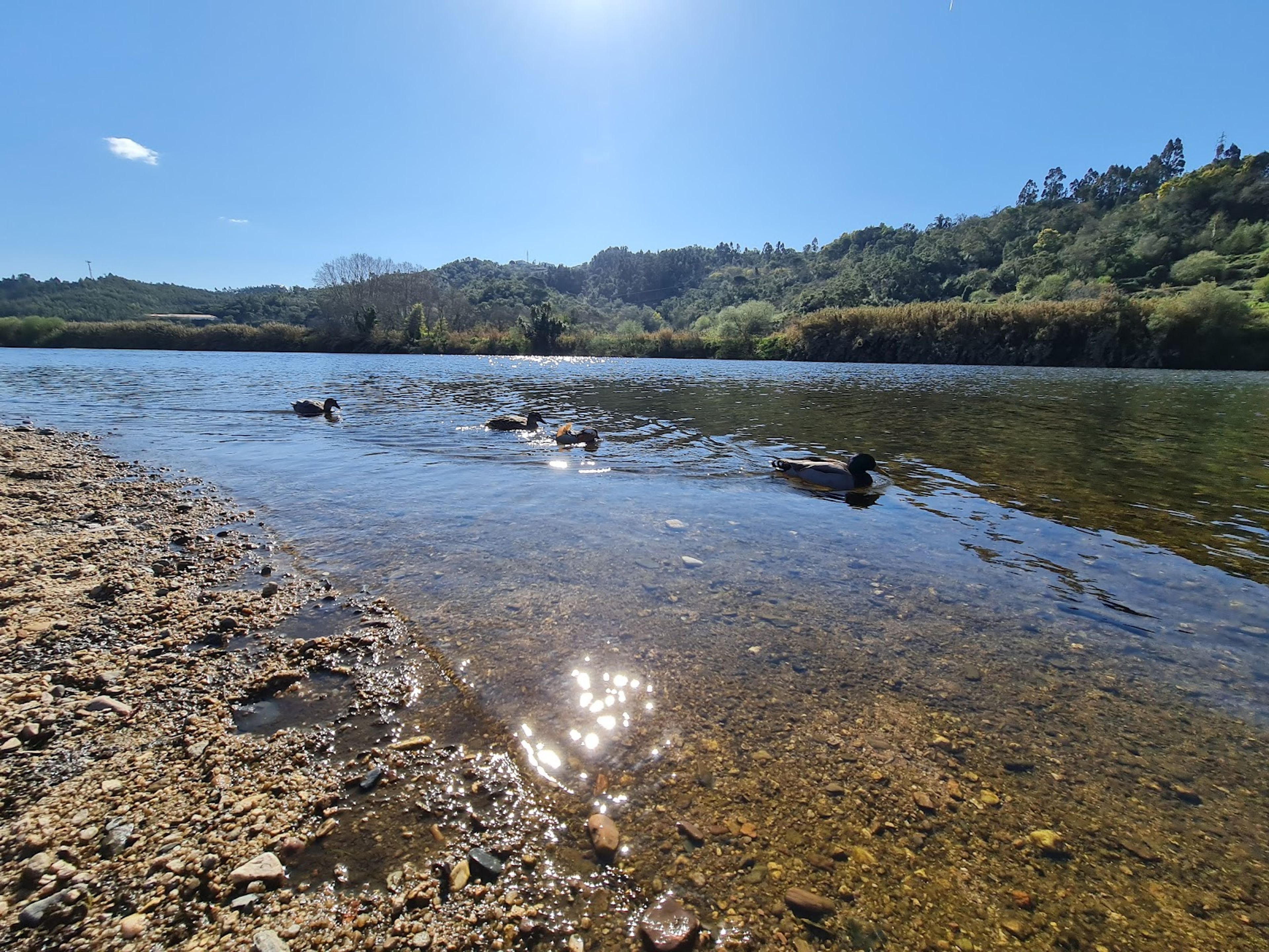Die Praia do Rebolim erstreckt sich entlang des Mondego-Flusses mit einem sandigen Ufer, umgeben von grünen Hügeln mit Erlen und Kiefern.