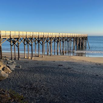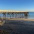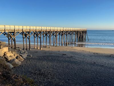 Der Memorial Strand erstreckt sich entlang der Pazifikküste mit einem Pier und einer geschützten Bucht, mit Ausblick auf die umliegenden Klippen.