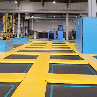 Die Anlage erstreckt sich über 4500 Quadratmeter mit 200 Trampolinen verschiedener Größen, verteilt auf mehrere spezialisierte Sprungbereiche.
