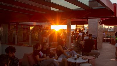 RT60 Rooftop Bar befindet sich im achten Stock des Hard Rock Hotel Madrid und bietet Panoramablicke auf die Stadtsilhouette mit moderner Dekoration, die New Yorker Stileinflüsse und kosmopolitische Designelemente integriert.