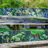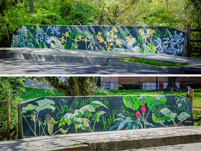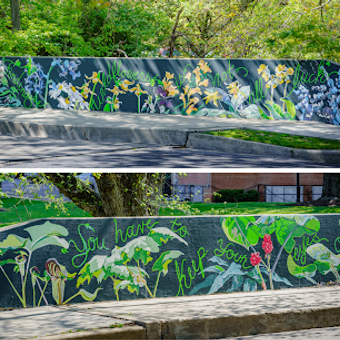 This 20--by-25 feet mural was inspired by Robert G. Ingersoll’s quote, “We Rise by Lifting Others” includes a scene of a migration of monarch butterflies using vibrant purples and blues atook about ten days to complete.