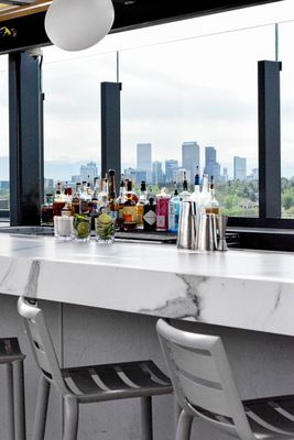Diese erhöhte Dachterrassen-Location auf dem Jacquard Hotel bietet Panoramablicke auf Denvers Skyline und die Rocky Mountains während sie handwerkliche Cocktails und leichte Häppchen serviert.
