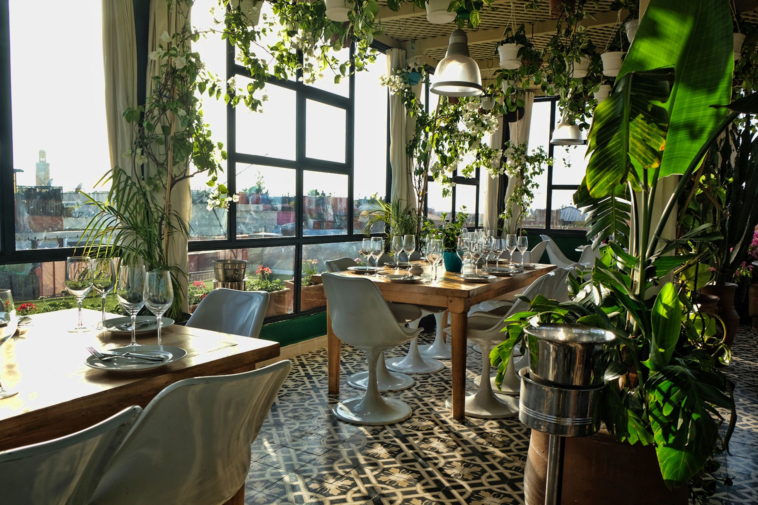 Le Salama erstreckt sich über drei Ebenen und präsentiert traditionelle marokkanische Dekoration gemischt mit kolonialen Elementen, bietet Innenessräume und eine erhöhte Dachterrasse mit Panoramablick auf das Atlasgebirge und die historische Medina darunter.