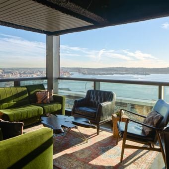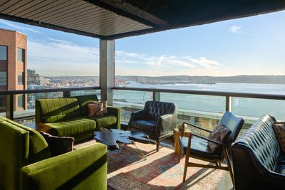 Diese erhöhte Einrichtung verfügt über eine Freiluftterrasse mit Panoramablick auf die Elliott Bay, die Olympic Mountain Range und Seattles Innenstadt-Skyline vom Thompson Hotel aus.
