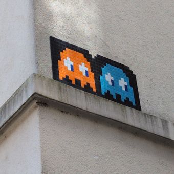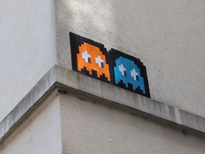 Dieses Mosaik besteht aus kleinen quadratischen Fliesen und zeigt zwei Geister-ähnliche Formen im Pac-Man-Stil, eine orange und eine blaue, beide mit großen weißen Augen und blauen Pupillen. Das Kunstwerk wurde von Invader geschaffen und an einer hellbraunen Wand angebracht, wobei jeder Charakter in schwarzen Fliesen umrissen ist.