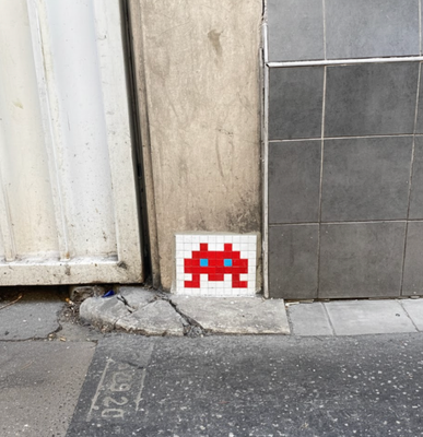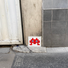 Dieses Werk von Invader ist ein kleines Mosaik auf einer hellen Wand, das eine rote Figur mit zwei blauen quadratischen Augen zeigt und wie ein Wesen oder Roboter aus Fliesen aussieht.
