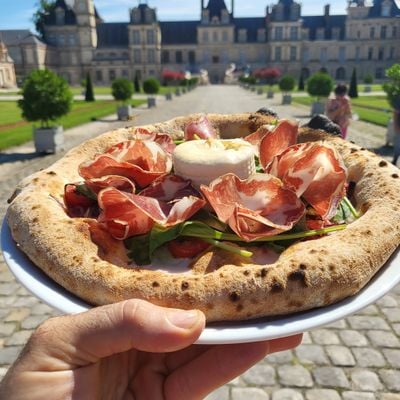 Die Terrasse bietet direkten Blick auf das Château de Fontainebleau, während Gäste die Pizzazubereitung in der offenen Küche beobachten können, was ein interaktives und lehrreiches Speiseerlebnis schafft.