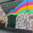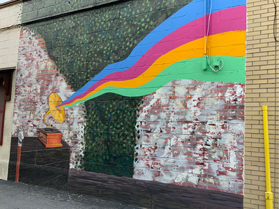 This 20--by-25 feet mural was inspired by Robert G. Ingersoll’s quote, “We Rise by Lifting Others” includes a scene of a migration of monarch butterflies using vibrant purples and blues atook about ten days to complete.