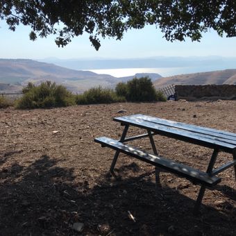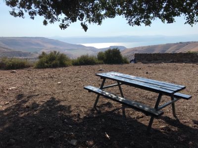 תצפית מדהימה על כנרת עם שולחנות וצל