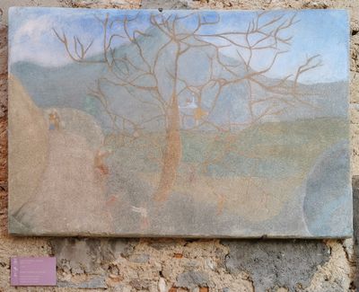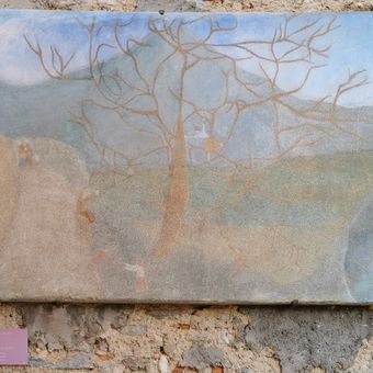 Dance around the tree, 1961 painting in the Arcumeggia open-air mural gallery, Casalzuigno, Italy, by Luigi Vittorio Lotesto