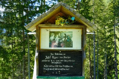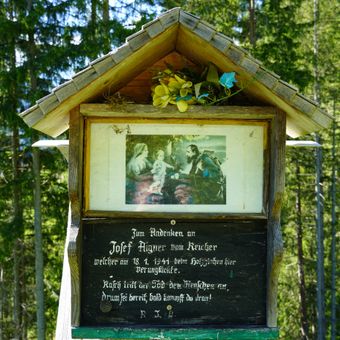 Inschrift: Zum Andenken an Josef Aigner vom Reicher, welcher am 18.01.1941 beim Holzziehen hier verunglückte. Rasch tritt der Tod den Menschen an, drum sei bereit, bald kommst du dran!