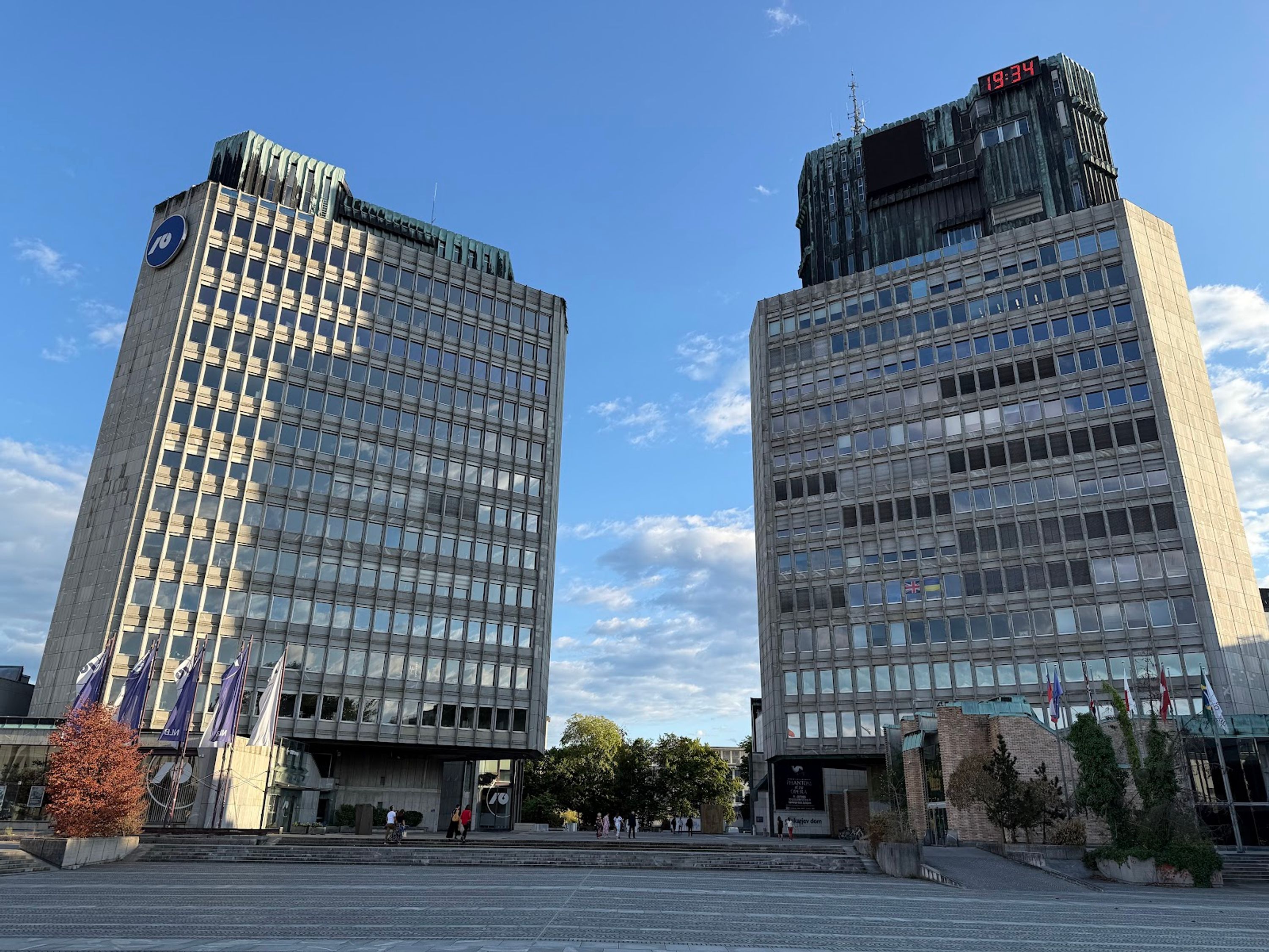 Trg republike ist der größte Platz in Ljubljana, erstreckt sich über etwa 300 Meter und zeigt modernistische Architektur mit Regierungsgebäuden, Hochhaustürmen und dem nationalen Kulturzentrum Cankarjev dom.