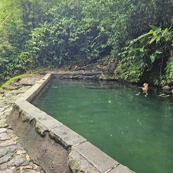 Les Bains Jaunes ist eine natürliche Thermaquelle in Saint-Claude auf etwa 950 Metern Höhe in der vulkanischen Region Guadeloupes. Das Wasser wird von der Soufrière gespeist, fließt in zwei natürliche Becken und erreicht eine Temperatur von etwa 30°C, wobei der Name der schwefelhaltigen Färbung stammt, obwohl das Wasser grün erscheint.