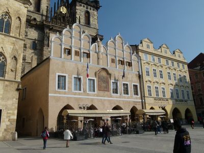 Die Teynschule steht am Altstädter Ring in Prag und zeigt traditionelle tschechische Architekturelemente und eine steinerne Fassade.