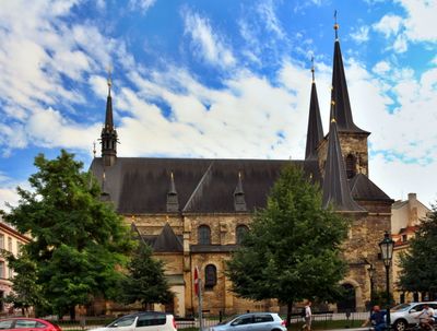 Die Kirche in der Biskupská-Straße enthält erhaltene romanische Türme und ein gotisches Portal, das im 15. Jahrhundert den ursprünglichen Eingang ersetzte.