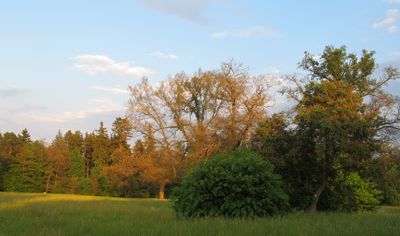 Der Dobříšský Park ist ein großer Parkgelände mit französischen und englischen Gartenelementen, durchzogen von Wanderwegen in verschiedenen Richtungen. Die Vegetation wechselt zwischen formalen Bereichen und natürlicheren Landschaftsteilen, wobei ein beeindruckendes Schloss und eine Orangerie die Komposition prägen.