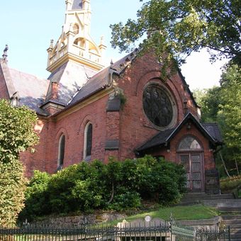 Die Lukaskirche aus roten Ziegeln steht auf dem Schlossberg mit einem Holzturm und kreuzförmigem Grundriss nahe dem Hotel Bristol.