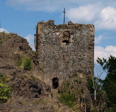 Die steinernen Überreste der Burg Ralsko stehen auf einem Hügel, mit Abschnitten von Mauern und Türmen, die die Struktur einer früheren Festung zeigen.
