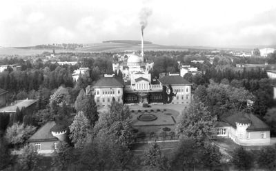 Die psychiatrische Einrichtung zeigt eine Sammlung von Gebäuden im Jugendstil mit geschwungenen Linien und Naturmotiven.