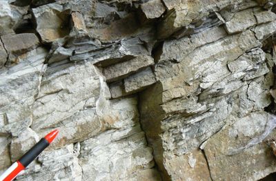 Der Felsen von Rybičková ist eine Naturformation bei Padochov mit sichtbaren Schichten aus Ton, Schluff und graugrünem Sandstein. Die Gesteinswand zeigt verschiedene geologische Ebenen, die über mehrere Meter hoch aufragen und die Struktur der Region deutlich machen.