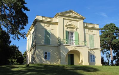Das Gebäude verbindet Jagdtraditionen mit neoklassizistischen Gestaltungsprinzipien, umgeben von künstlichen Seen und bewirtschafteten Wäldern.