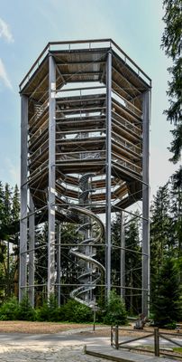 Die Konstruktion dieses erhöhten Wanderwegs wurde 2012 fertiggestellt und etablierte den ersten Baumwipfelpfad in der Tschechischen Republik.