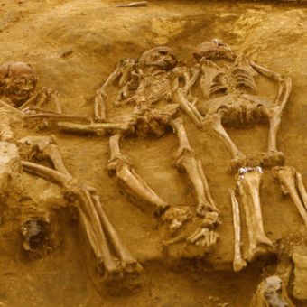 Das Grab enthält drei männliche Skelette in einer spezifischen Anordnung, wobei eines zum zweiten gewandt ist, während das dritte mit dem Gesicht nach unten liegt.