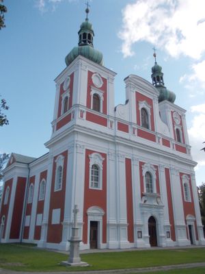Diese Barockkirche steht auf dem Hügel Cvilín und hat zwei Türme, Steinmauern und detaillierte architektonische Elemente aus dem 18. Jahrhundert. Das Gebäude zeigt die klassischen Merkmale des Barockstils mit seinen strukturellen Besonderheiten und kunsthandwerklichen Details.