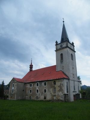 Die Sankt-Katharina-Kirche steht als Ziegelbau mit Renaissance-Grundmauern und gotischen Elementen nahe der deutschen Grenze in Nordböhmen.
