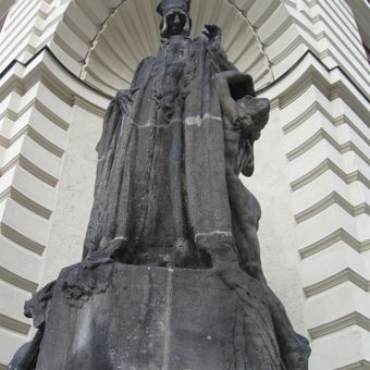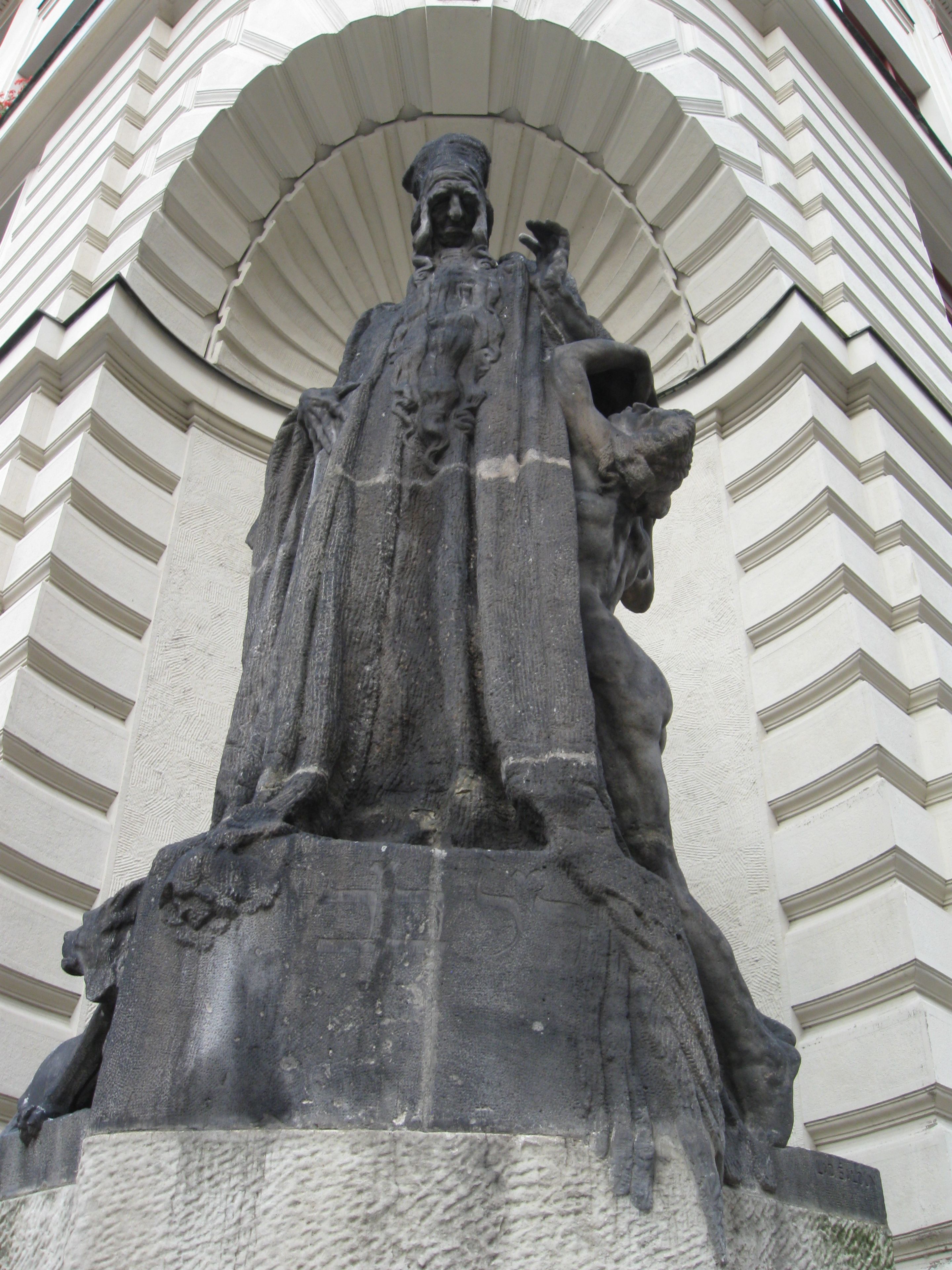 Sochy vpravo nad portálem Městské knihovny v Praze 1