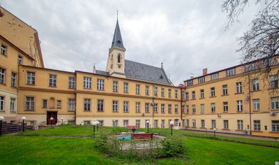 Der neoklassizistische Klosterkomplex umfasst die Herz-Jesu-Kirche mit einem quadratischen Turm und Satteldach in der Holečkova-Straße.