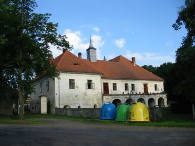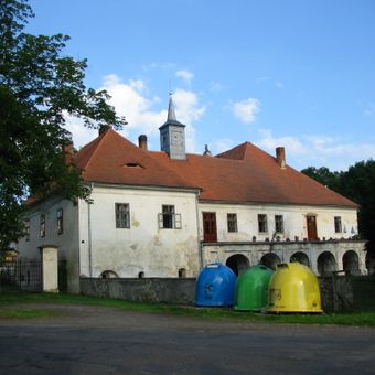 Socha svatého Jana Nepomuckého uprostřed křižovatky u zámku v Mačicích