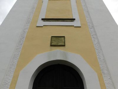 Pamětní deska nad vstupem kostela v Sobíňově, pamětní deska v obci Sobíňov, okres Havlíčkův Brod