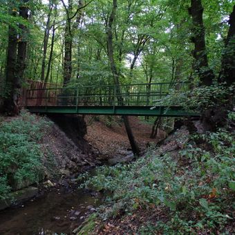 Lávka přes Kunratický potok v místě vtoku do areálu Thomayerovy nemocnice, lávka v Kunratickém lese v Praze-Kunraticích