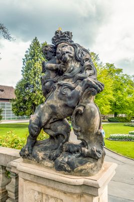 Socha lva vlevo od schodiště v Královské zahradě na Hradčanech, statue in Prague, Czech Republic
