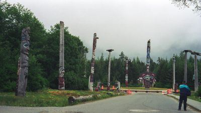Der Park zeigt einheimische Totempfähle und geschnitzte Denkmäler entlang der Totem Road, mit Treppen zu einem zentralen Platz.