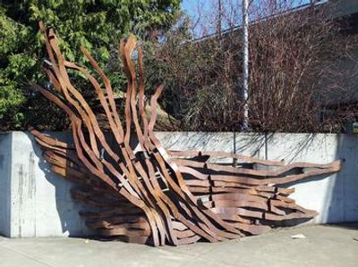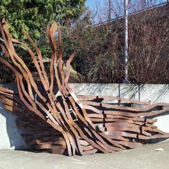 Die Skulptur stellt die geologischen Schichten des Willamette-Flusses vor der Stadtentwicklung Portlands durch Kupferstreifen und Metallartefakte dar.