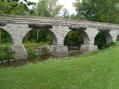 Die Avon Fünfbogenbrücke erstreckt sich über 200 Fuß Länge, misst 12 Fuß Breite und erhebt sich 30 Fuß über den Auslass des Conesus-Sees.