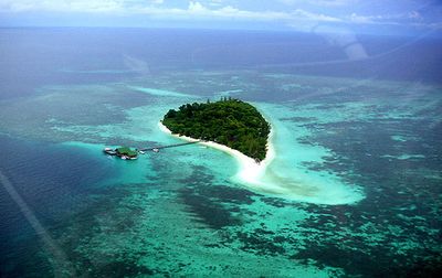 Die weißen Sandstrände der Lankayan Insel erstrecken sich entlang dichter tropischer Vegetation und bilden eine natürliche Umgebung im Sulu-Meer.
