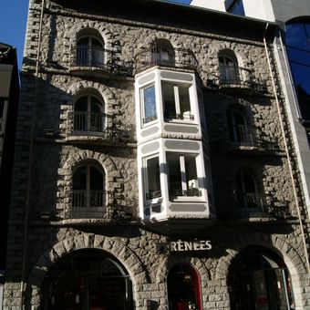 Die Antiga Vegueria Francesa weist eine Granitarchitektur mit abgerundeten Balkonen und einer hervortretenden Mitteltribüne an der Meritxell Avenue auf.