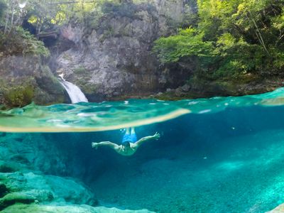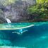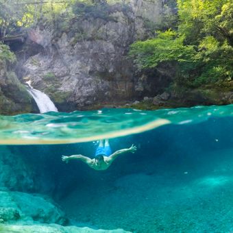 Die Blue Eye Quelle bildet einen Wasserfall zwischen Kalksteinfelsen und erschafft einen türkisfarbenen Pool, umgeben von den albanischen Alpen.