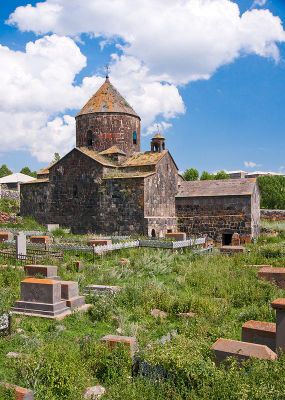 Der Friedhof um die Kirche enthält mittelalterliche und zeitgenössische Gräber, während geschnitzte Khachkars die Innen- und Außenwände schmücken.
